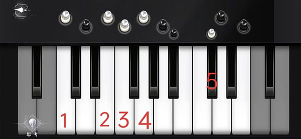 钢琴处观察—弹奏,进入钢琴界面后,先点击思考得出位置与颜色,然后只弹奏白色棋子对应的琴键,如下图所示: