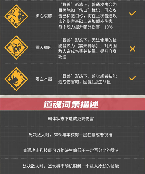 如果选用了【魂力-震天狮吼】还能释放技能眩晕附近的敌人,提升自身的攻速,再搭配上【魂力-嗜血本能】,每次攻击敌人都能获得生命值回复,持久作战能力大幅增强!