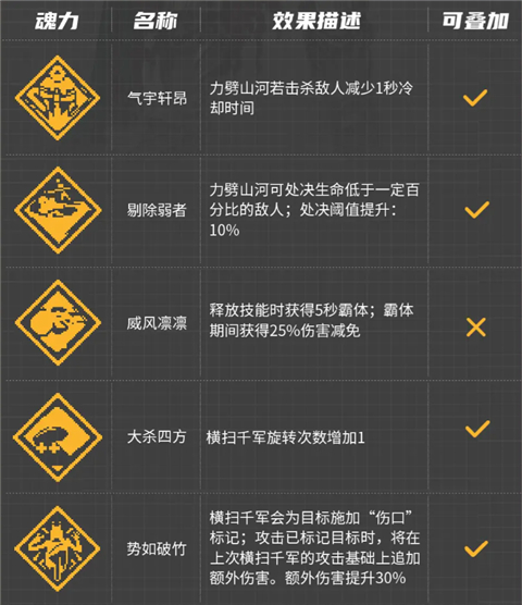 搭配【技能风格-历久弥坚】和【魂力-气宇轩昂】、【魂力-剔除弱者】,可以不断提升力劈山河的技能倍率,在战斗中越战越强,力破千钧,横扫战场!