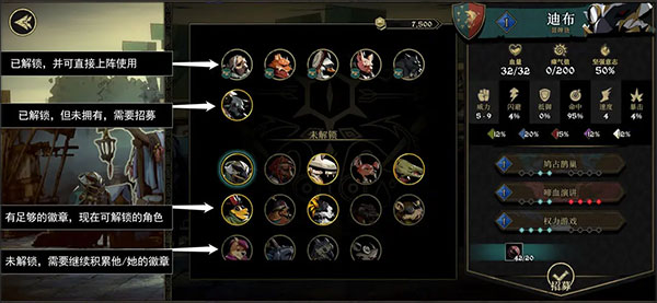 已解锁区域 - 不带小喇叭,是你可以招募的,角色死亡后,你喜欢哪个就招募哪个。招募到的是1级的全新角色。