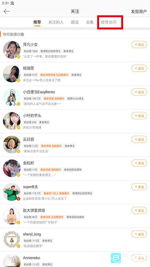 3、进入关注页面后,点击经常访问选项,就能看到经常访问的人了