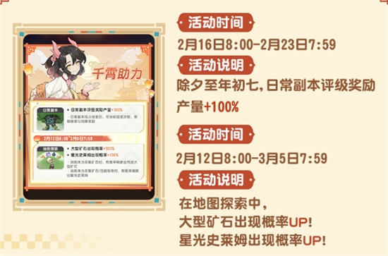 1、日常副本翻倍:2月16日8:00-2月23日7:59,除夕至年初七期间,日常副本评级奖励产量+100%。