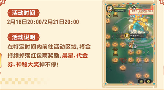 2、福利内容:指定时间前往活动区域,即可参与红包雨活动,掉落晨星、代金券、神秘大奖等奖励。
