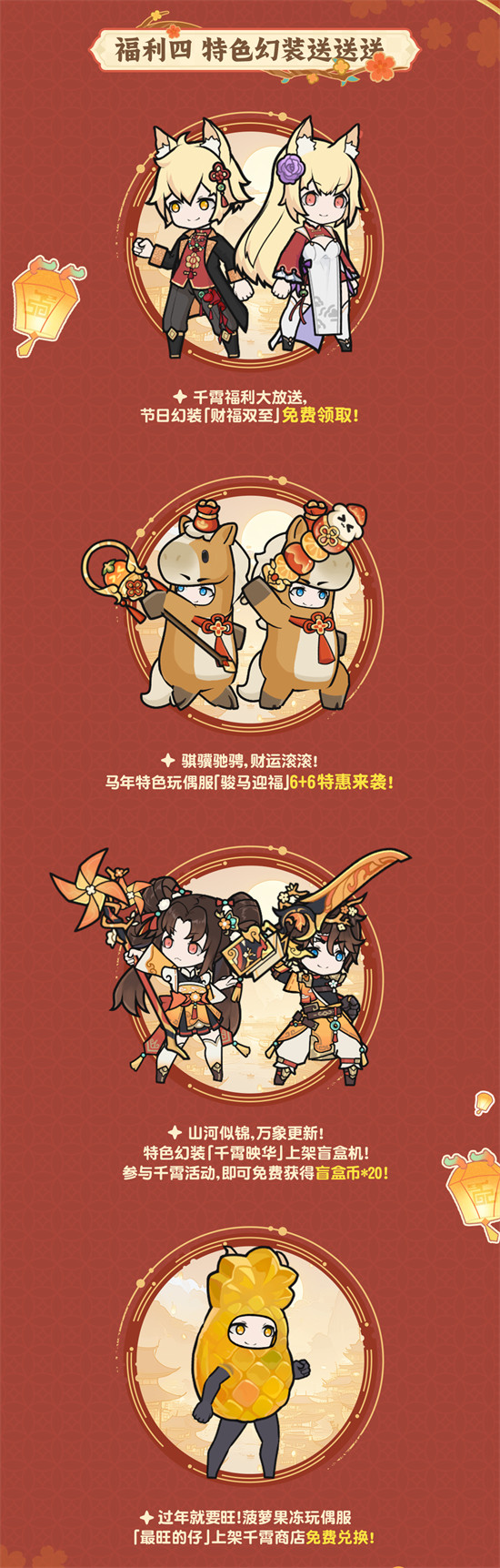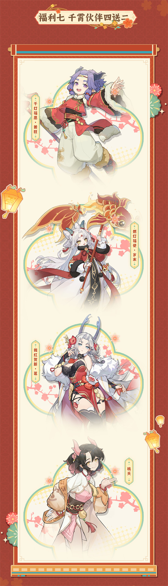 上线千灯福愿・姜旺、燃灯福使・岁末、裁红贺新・茗、桃夭四位限定伙伴,可自选其二获取(注:其中部分伙伴需通过礼包购买,68元/个)。