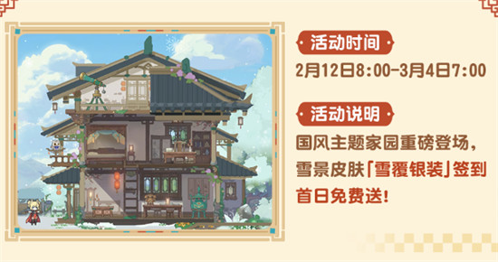 2、福利内容:国风主题家园上线,雪景皮肤「雪覆银装」签到首日即可免费领取。