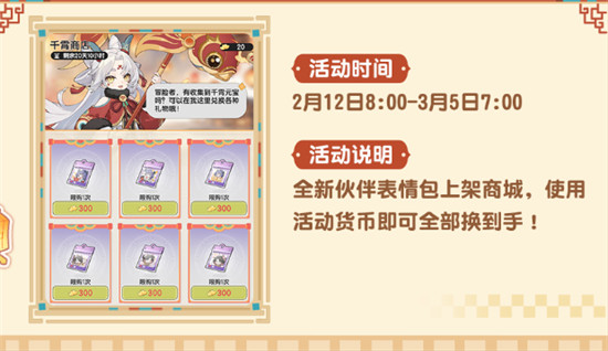 福利内容:全新伙伴表情包上架千霄商店,使用活动货币即可全部兑换。