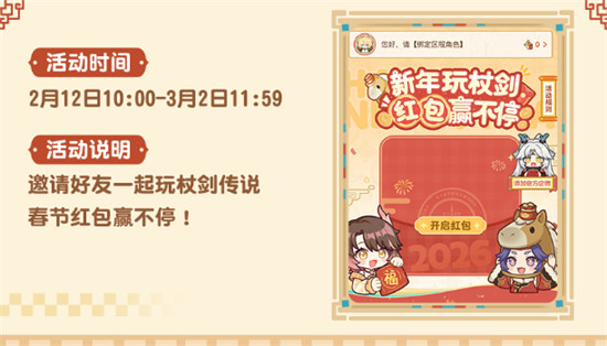 福利内容:邀请好友一起游玩《杖剑传说》,即可参与活动赢取春节现金红包。